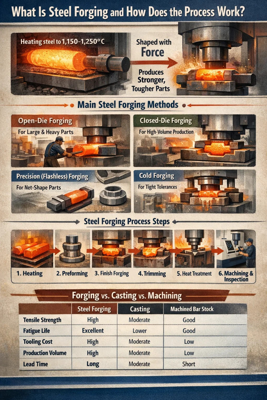 Každá metóda kovania ocele produkuje diely s rôznymi rozmerovými toleranciami, stavmi povrchu a nákladmi na nástroje. Nesprávny výber zvyšuje náklady, predlžuje dodaciu lehotu alebo vedie k dielom, ktoré vyžadujú nadmerné sekundárne obrábanie.