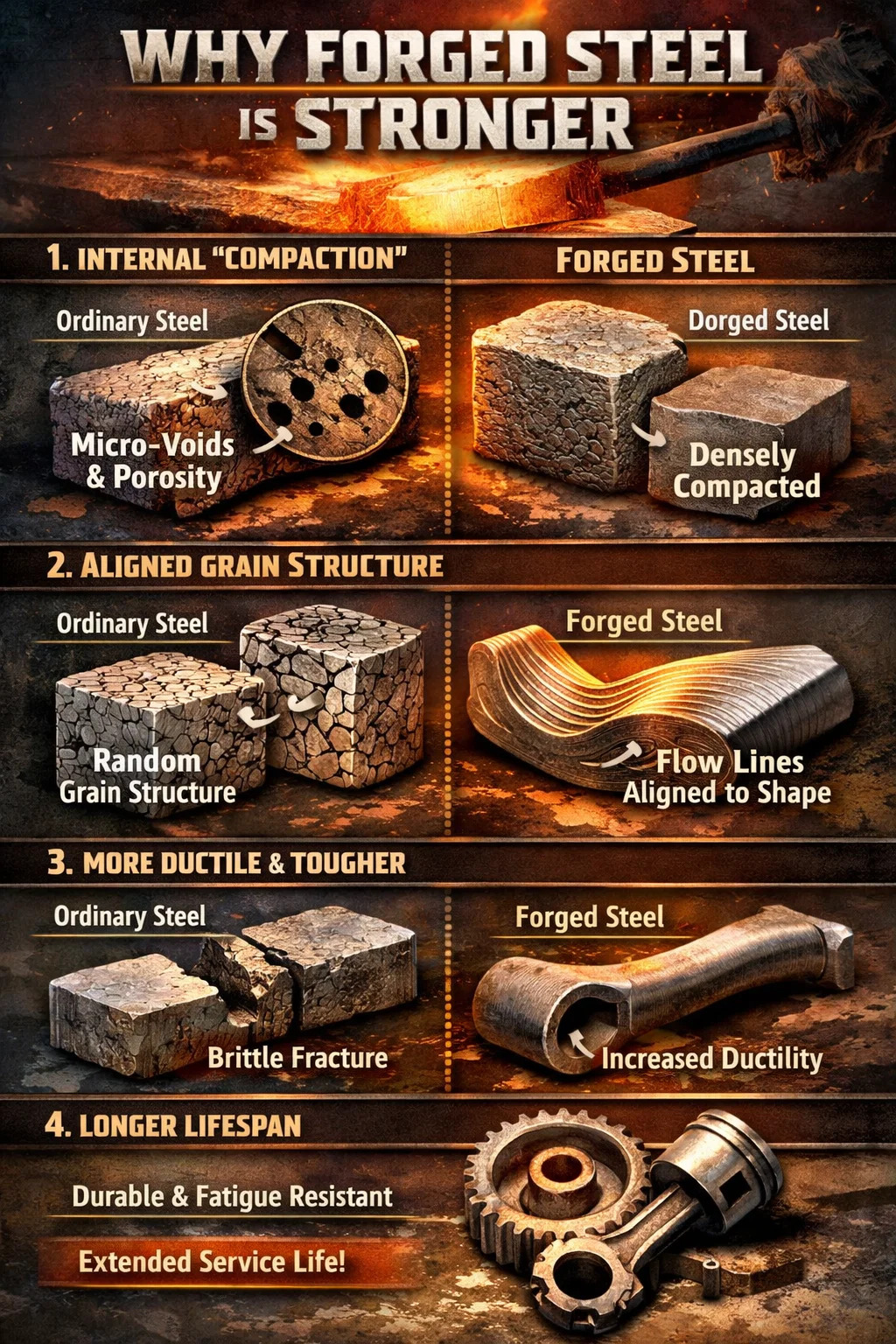 Kovaná oceľ: Pod obrovským tlakom sú tieto malé póry úplne sploštené a zvarené, čím sa celý kus kovu stáva hustým ako pevný blok. Bez vnútorných defektov je diel prirodzene pevnejší.