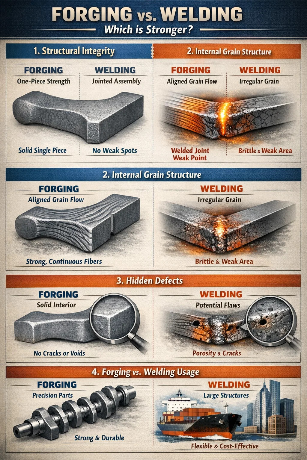 Cena: Zváranie je vhodné pre veľké a zložité konštrukcie, zatiaľ čo kovanie je vhodnejšie pre presné a pevné komponenty.