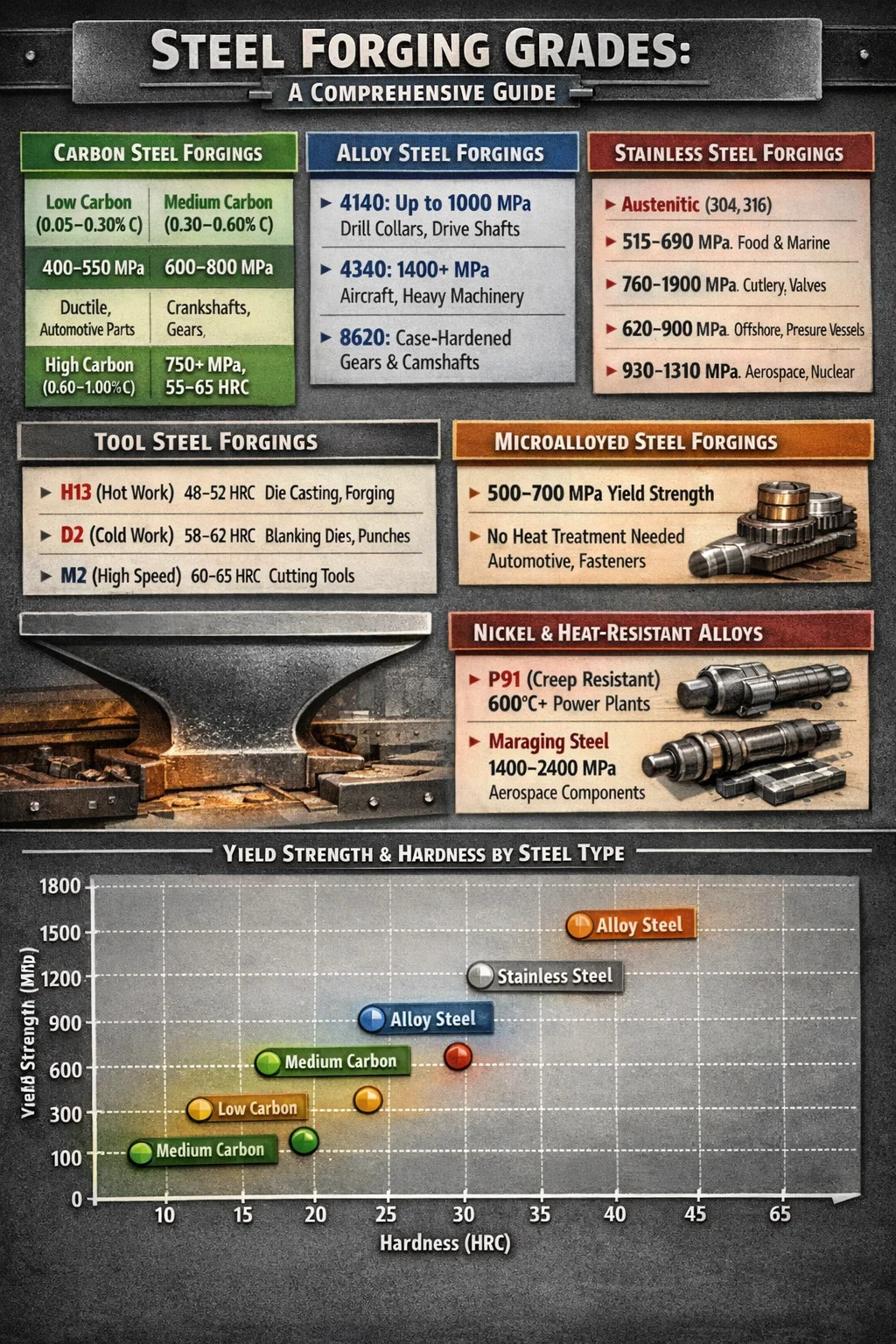Oceľové kovanie je jedným z najstarších a najspoľahlivejších kovoobrábacích procesov vo výrobe. Krátka odpoveď na to, aké druhy kovacej ocele existujú: uhlíková oceľ, legovaná oceľ, nehrdzavejúca oceľ, nástrojová oceľ a mikrolegovaná oceľ je päť základných kategórií používaných pri priemyselnom kovaní ocele. Každý typ spĺňa odlišné mechanické a environmentálne požiadavky a výber nesprávneho typu môže viesť k predčasnému zlyhaniu, bezpečnostným rizikám alebo zbytočnému prekročeniu nákladov.