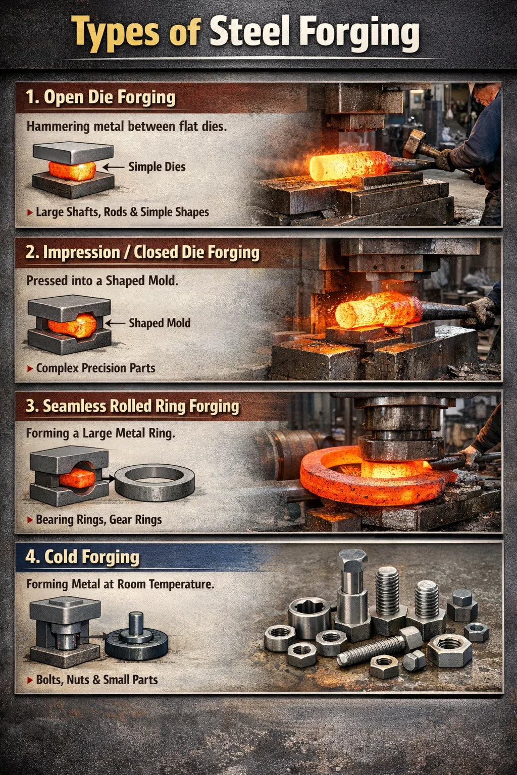 V oblasti spracovania kovov existuje veľa rôznych procesov kovania. Podľa najbežnejšej klasifikačnej metódy oceľové kovanie zvyčajne možno rozdeliť do nasledujúcich štyroch kategórií: