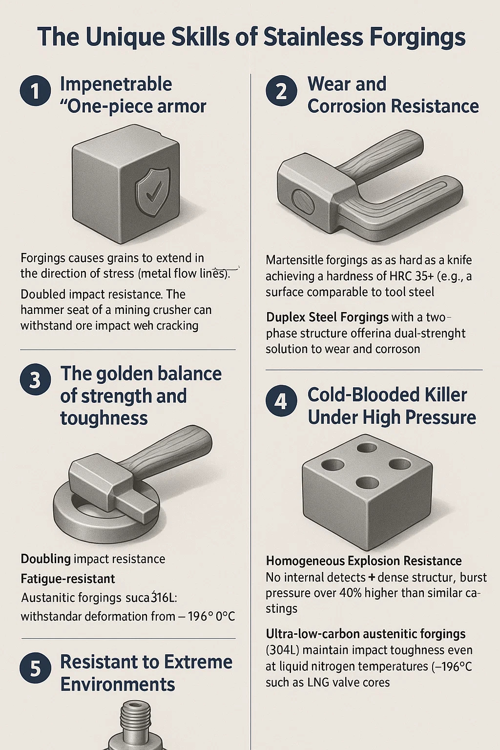 Nepreakovateľný: Kovanie dôkladne zhutňuje póry a zmršťovanie a nezanecháva žiadny priestor na vstup korozívnych médií - kasty sú ako špongie, výkovky sú ako pevné ingoty.